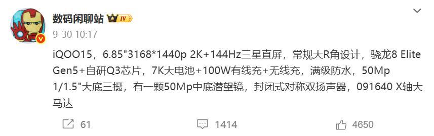 iqoo 15最大的亮点是这块2k屏幕,采用三星M14发光材质,成本比较高,屏幕观感很出色,是一块6.85英寸2k直屏,还有超声波指纹解锁。
