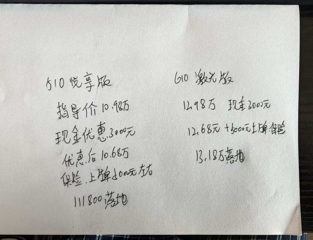 写在最后,本次看车还是比较轻松,愉快的,销售推荐的510悦享版和600激光雷达版的品价比还是比较高的,510悦享版基础配置足够使用,600激光雷达版在辅助驾驶和主动安全方面更加全面,体验也更好,两款车型均搭载218马力的电机,加速性能可以媲美2.0T轿车,续航为510km和600km,对于市区用车和长途出行都可以胜任。小编也看了一些同级别车型,对比之下,B10用更低的价格能获得更高的配置,10万出头的预算是不错的选择!预算在11万元左右可以选择510悦享版,13万出头则可以选择600激光雷达版。